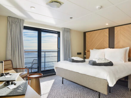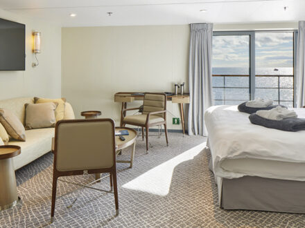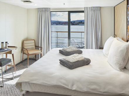 El alojamiento en su crucero Magellan Explorer está disponible en siete categorías diferentes. Desde las cabinas individuales con ojo de buey hasta la opulencia de la Grand Suite, con su cama king-size, zona de estar independiente con sofá cama queen-size y mesa de café, y balcón privado con zona de estar.