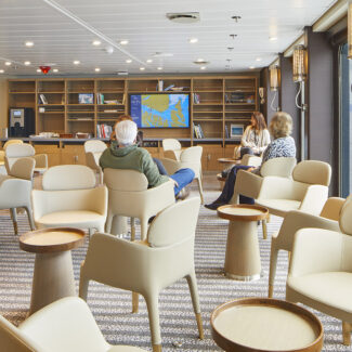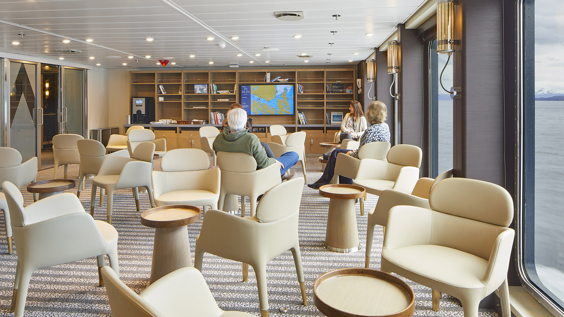 A bordo, cuando no esté en la cubierta de observación, encontrará una sala de reuniones con un laboratorio científico interactivo, una biblioteca repleta de libros de temática antártica en varios idiomas, una tienda de regalos, una sauna que ofrece la mejor manera de entrar en calor tras la exposición al aire helado y un gimnasio con ventanas panorámicas para no perderse ninguna cola de ballena mientras hace ejercicio.