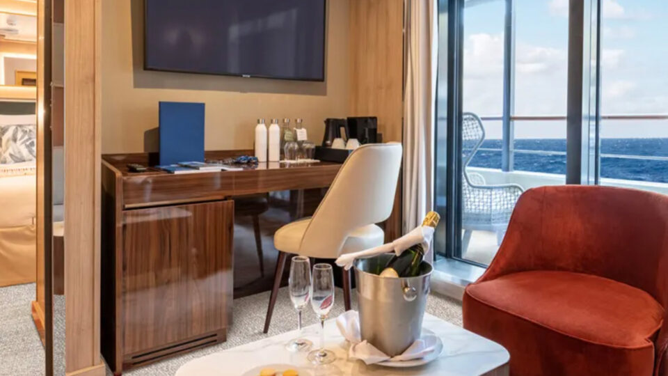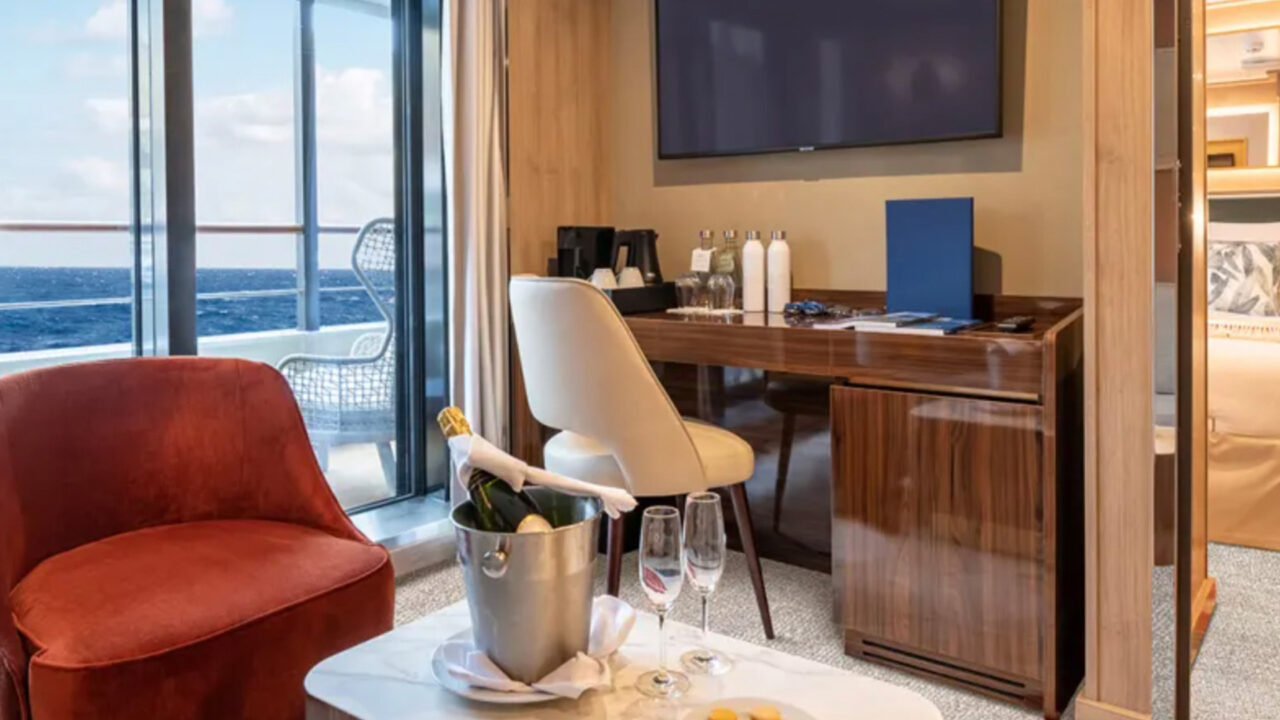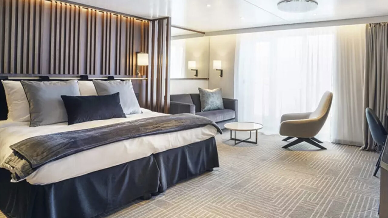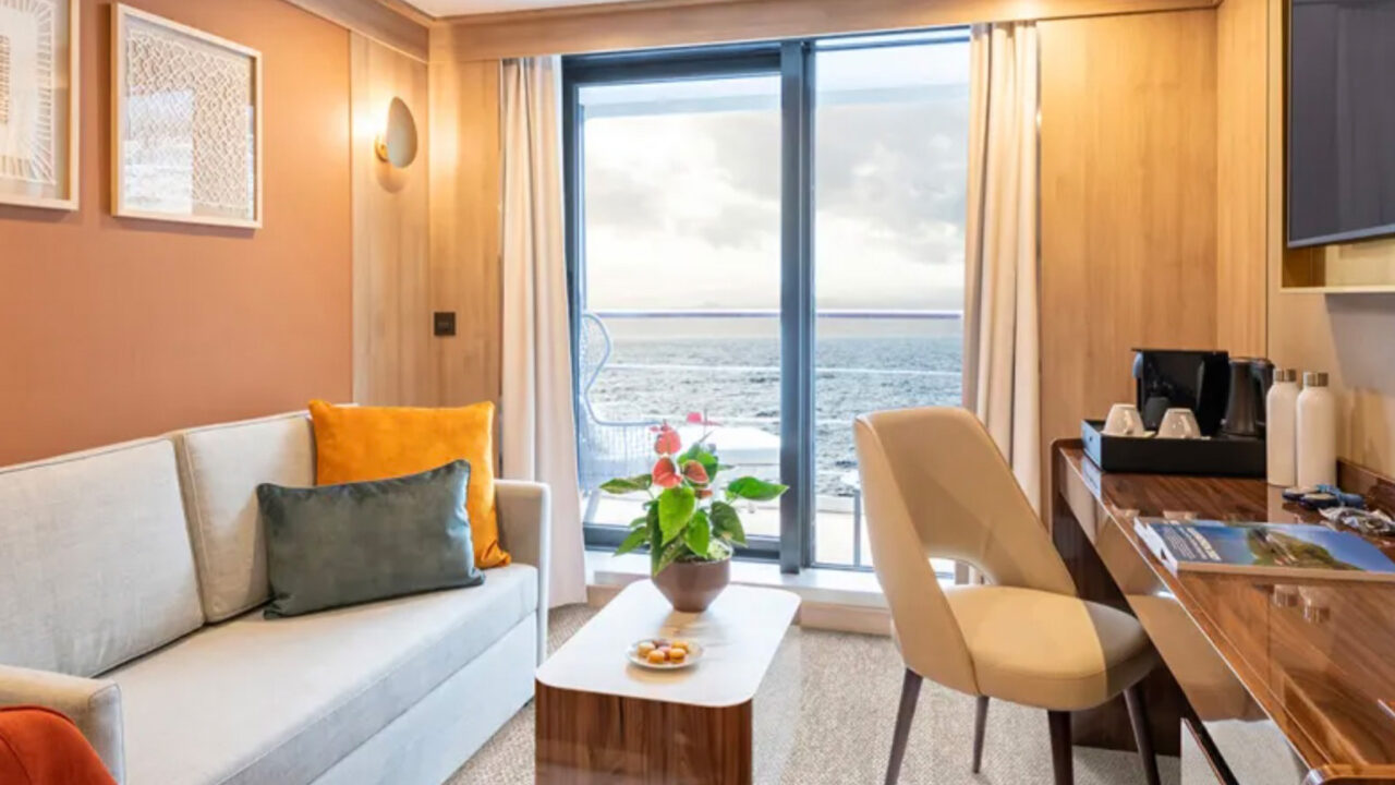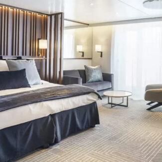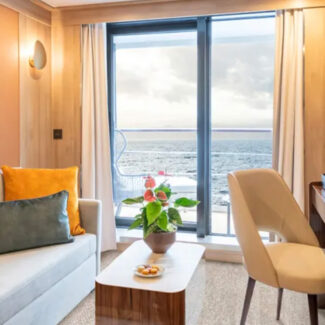 Las cuatro Junior Suites ofrecen un paisaje impresionante desde sus miradores de la cubierta 7. Cuando no esté disfrutando de un aterrizaje, puede relajarse en la sala de estar separada de las suites, o simplemente ver el mundo flotar desde el balcón privado.