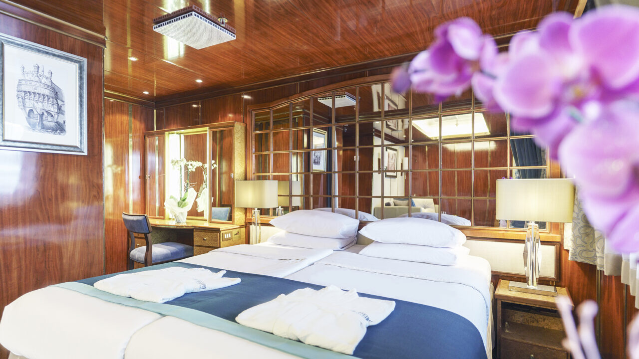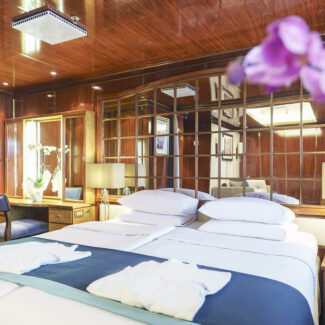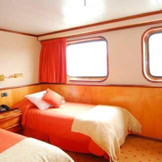 Las cabinas dobles de la cubierta inferior disponen de dos literas, baño privado y un ojo de buey con vistas al exterior. Tenga en cuenta que las tapas de los ojos de buey pueden estar cerradas durante los días de mar o las inclemencias del tiempo como medida de seguridad.