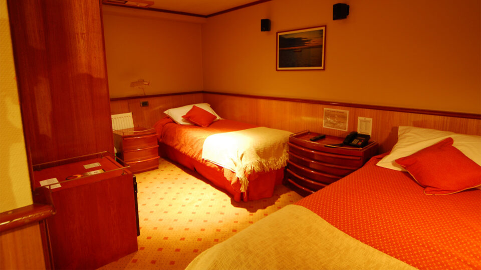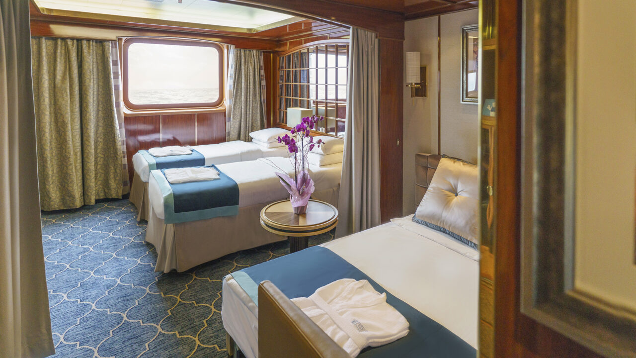 Una cabina triple tiene dos literas inferiores y una litera superior, instalaciones privadas y un ojo de buey con vistas al exterior. Tenga en cuenta que las tapas de los ojos de buey pueden estar cerradas durante los días de mar o en caso de mal tiempo como medida de seguridad. Los huéspedes de la cubierta principal también tienen acceso directo a los muelles de carga.