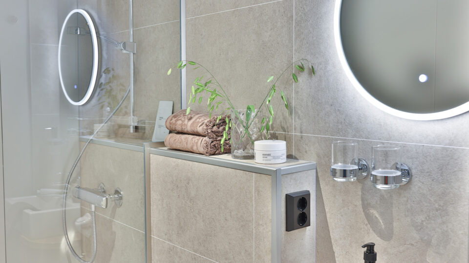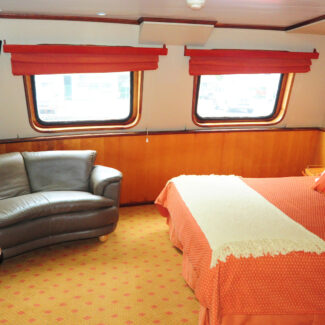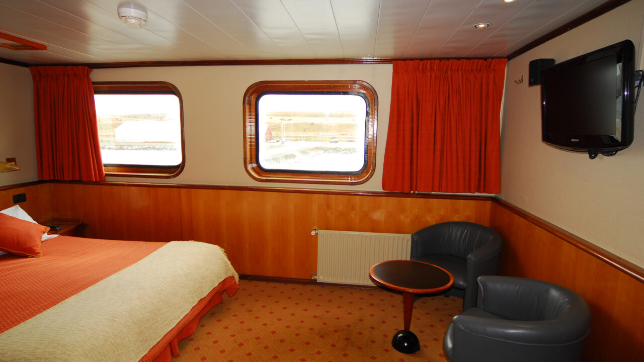 Cabina con zona de estar, ojo de buey y dos camas individuales o una cama extragrande. También dispone de armario, calefacción regulable y baño privado con ducha y calefacción por suelo radiante.