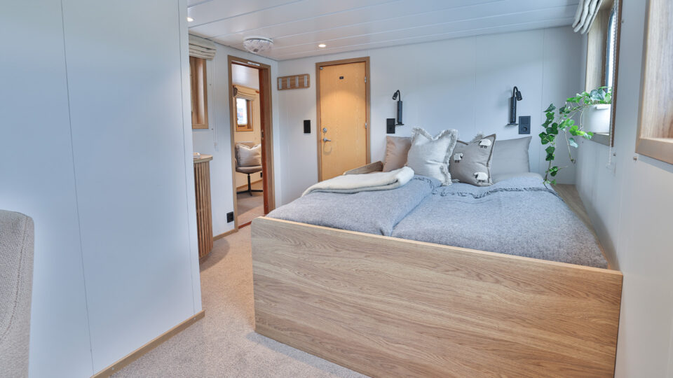 Cabina con 2 cuartos de baño privados más grandes con ducha separada y calefacción por suelo radiante. Los 2 dormitorios cuentan con 2 camas individuales o 1 cama de matrimonio, y un sofá cama tamaño queen. La habitación también está equipada con armario y calefacción regulable.