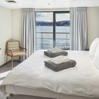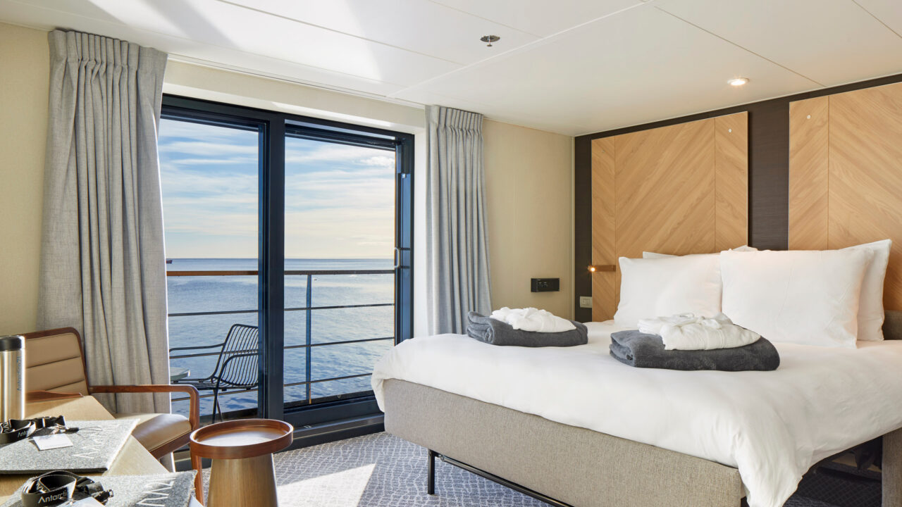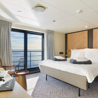 With a bit more room to stretch the legs, the Balcony Suite Superior cabins are perfect for polar adventurers who travel with plenty of gear. Located on Deck 4 and 6, the Cabins feature floor to ceiling windows, en-suite bathrooms and a comfortable desk area. Some of these rooms are equipped with wheelchair accessible bathrooms.