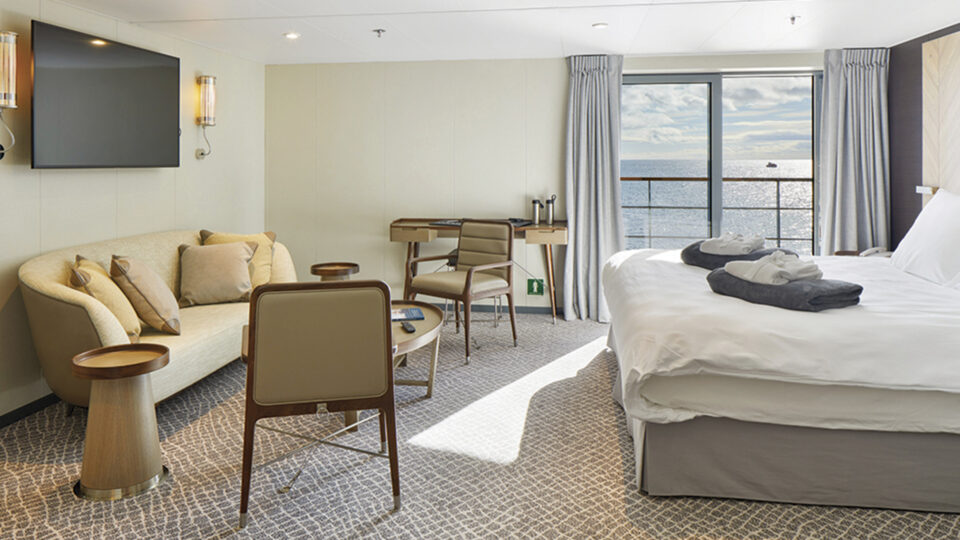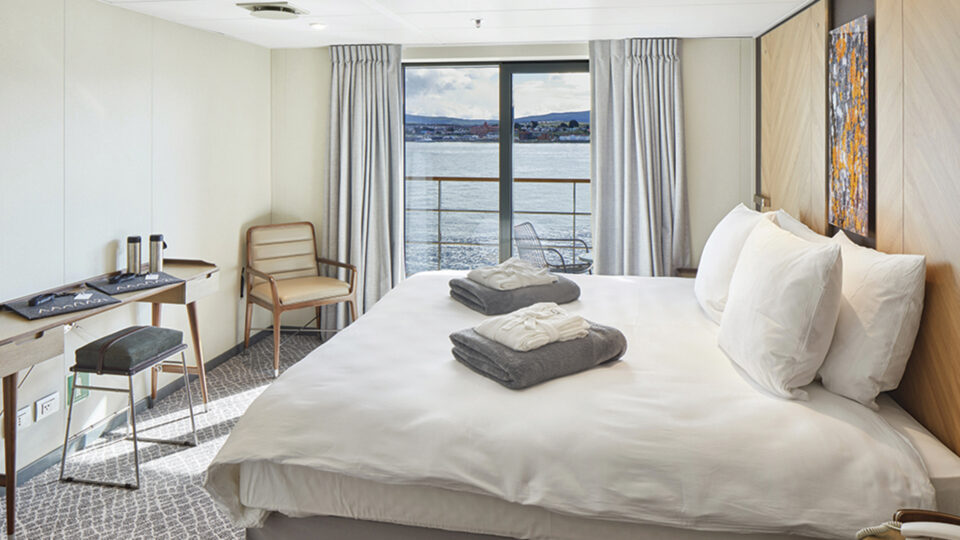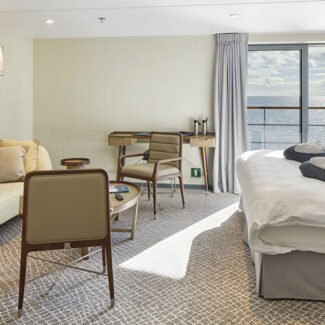 With a bit more room to stretch the legs, the Aurora Cabin Superior are perfect for polar adventurers who travel with plenty of gear. Located on Deck 7, the Staterooms feature french balconies, floor to ceiling windows, en-suite bathrooms and a comfortable desk area.