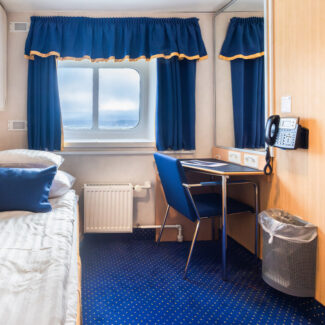 Twin cabins have two lower twin beds. These cabins also feature a picture window, a writing desk with a chair, a wardrobe, an individually controlled heating system, and a private bathroom with a shower.