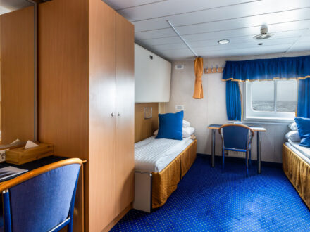 Guests are accommodated in comfortable outside cabins, located on the Upper and Bridge decks. Each cabin features a picture window, a writing desk with a chair, a flat-screen TV, DVD player and 200-volt outlets, a wardrobe, an individually controlled heating system, ample storage space, and a private bathroom with a shower.