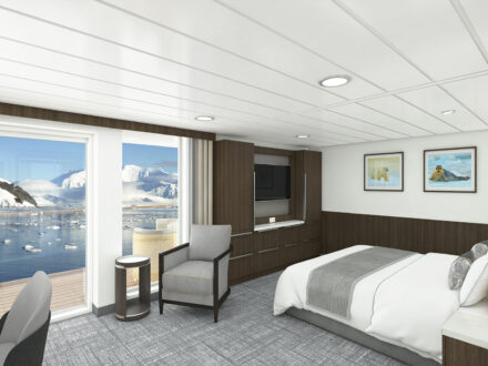 There are 71 cabins in eight different categories, ranging in size from 479 square feet to 226 square feet, and each with its own ensuite bathroom. Some 60% of cabins can accommodate a third person upon request. Top of the range is the Captain’s suite, of which there is only one, so be sure to book well in advance if you’d like to take advantage of this luxury. Some of the cabins have wheelchair-accessible bathrooms, and many are interconnecting for families and groups.